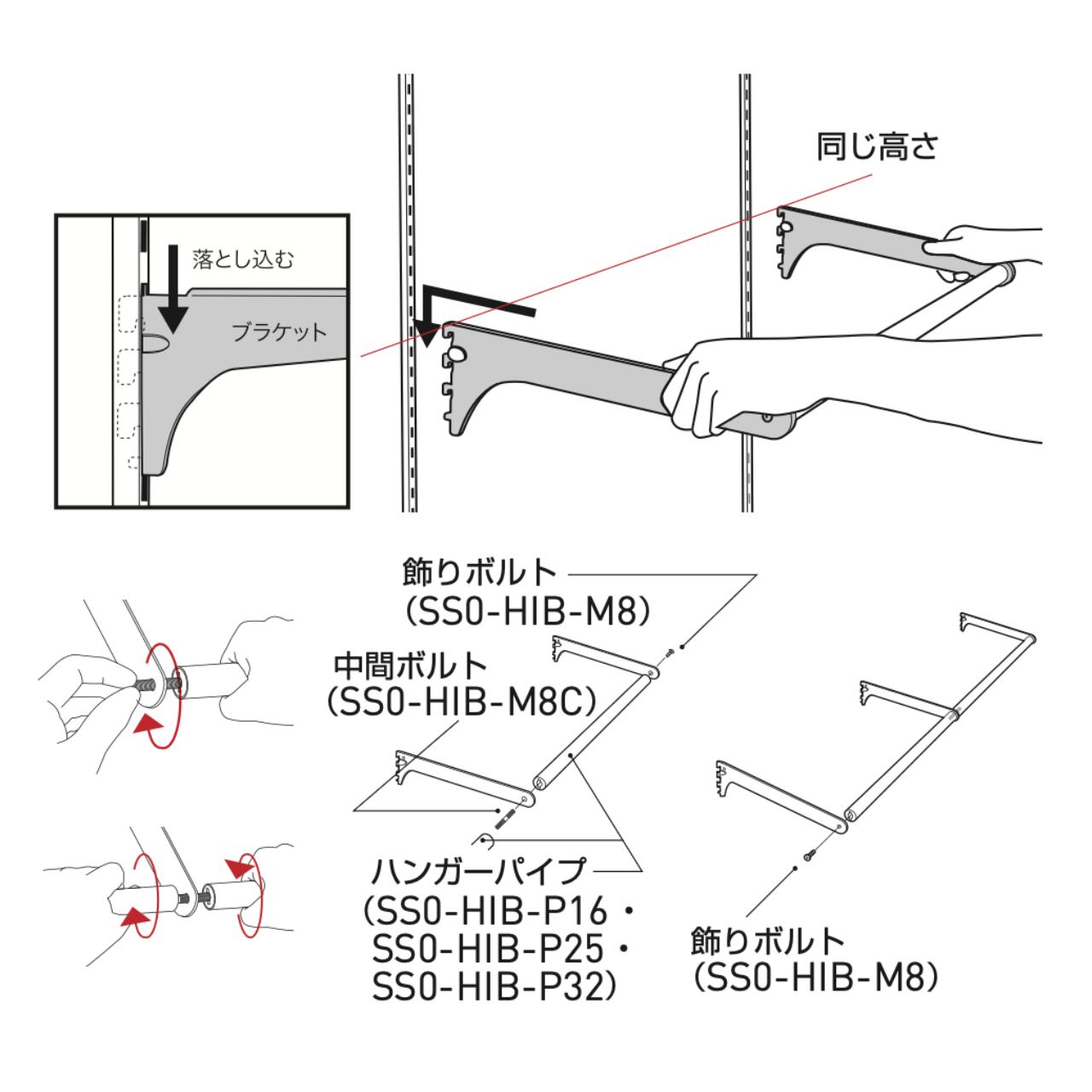 ・事前組み立て:ハンガーブラケットとパイプ(別売)と飾りボルト(別売)で固定します。プラスドライバーをご用意ください。